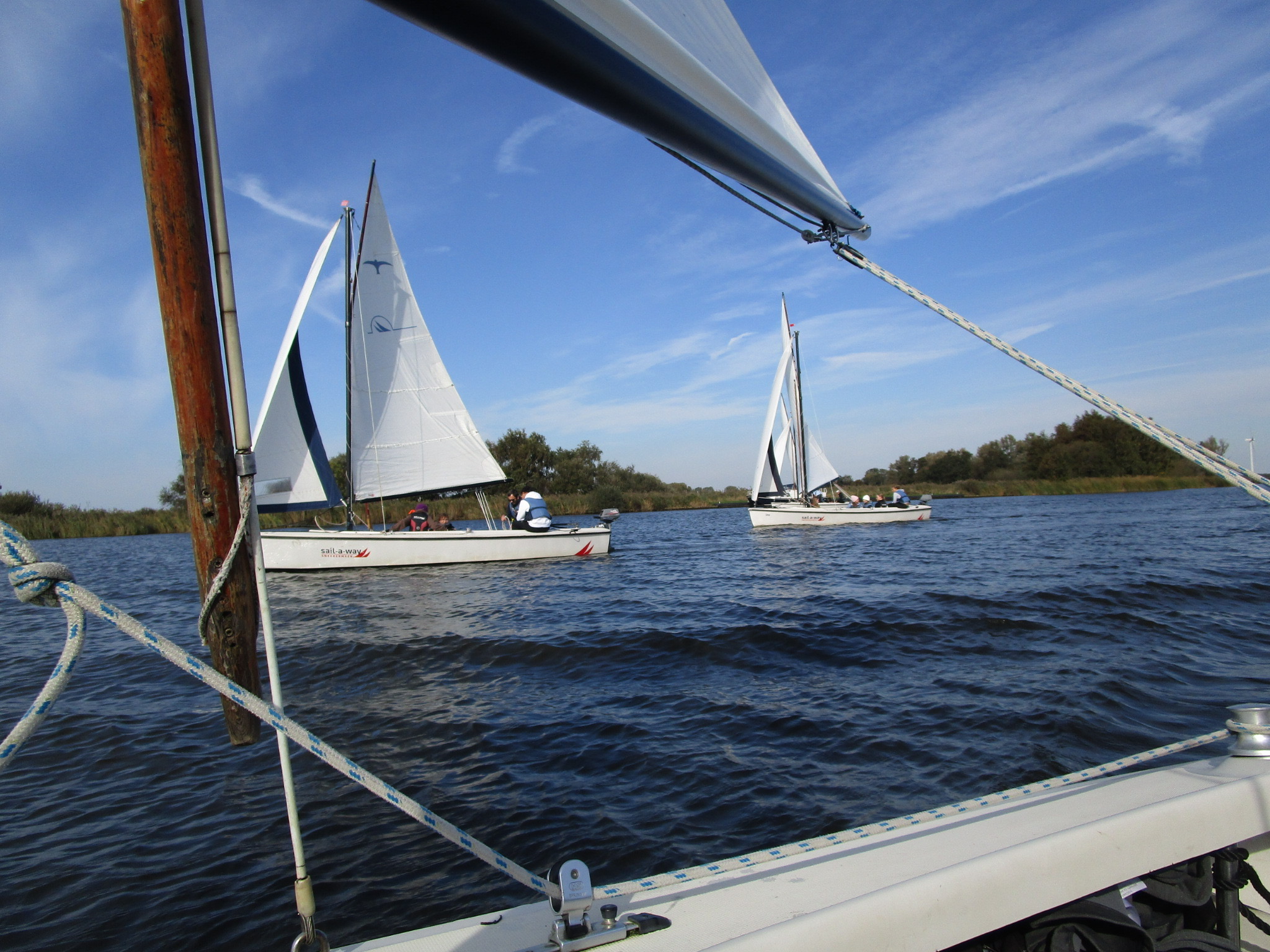 Auch dieses Jahr sind die 9. Klassen wieder zum Segeln ans Sneekermeer in die Niederlande gefahren. Nach unserer Ankunft bezogen wir die Kajüten auf dem großen Segelschiff Poolster, das für die Dauer unserer Reise zu unserem Zuhause wurde. Nach dem Frühstück und der morgendlichen Theoriestunde brachen wir täglich zu einer langen, eindrucksvollen Segelfahrt auf. In kleinen „Falken“ lernten wir in Dreier- oder Vierergruppen – jeweils mit einer Segellehrkraft – auf den Kanälen und Seen selbstständig zu segeln. Wir erfuhren, wie man die Windrichtung bestimmt und passende Manöver anwendet. In den schönen Städtchen, in denen wir für die Mittagspause anlegten, konnten wir uns ausruhen, einkaufen und spazieren gehen.