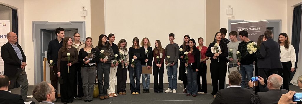 Für das Engagement und die Projektrealisierung zeichnete am 5.11.25 die SPD Karlsruhe nun die 28 Schüler*innen, die Schülerakademie und das Generallandesarchiv für die gemeinsame Arbeit mit dem Ludwig-Marum-Preis aus, die Laudatio hielt Dr. Boris Weirauch, rechtspolitischer Sprecher der SPD-Landtagsfraktion.